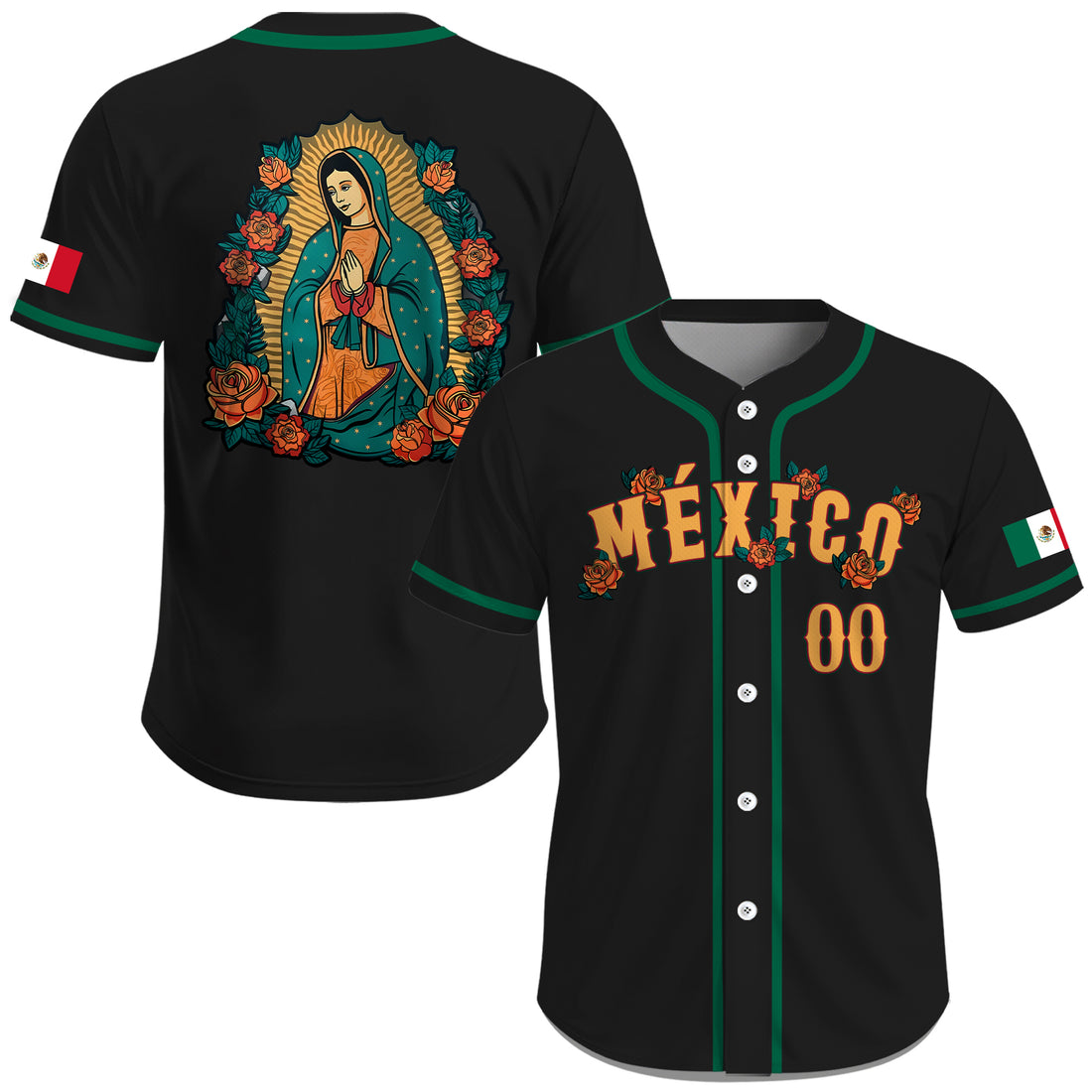 Jersey de Béisbol Personalizado de México Negro con Diseño de la Virgen de Guadalupe