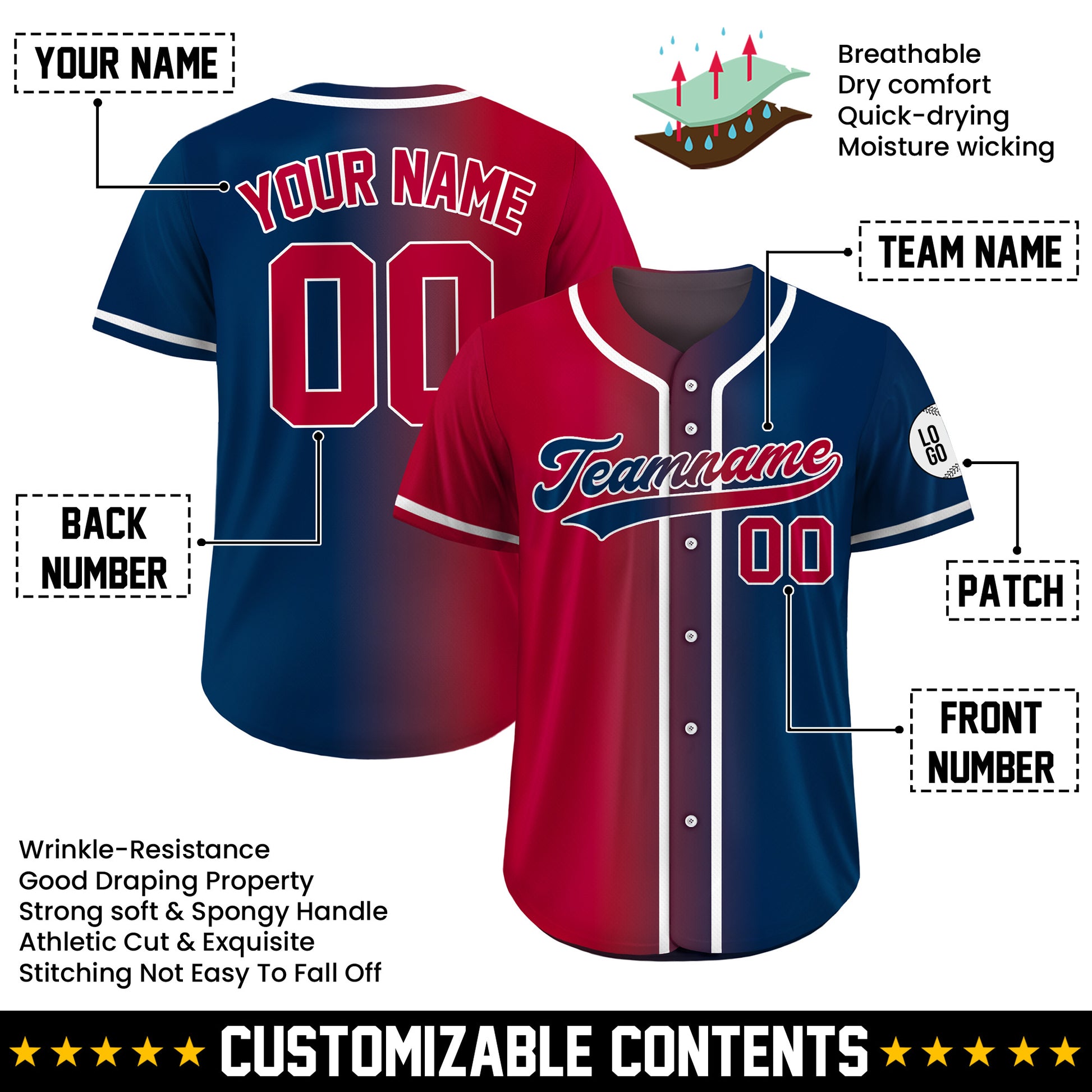 Our gradient baseball jersey puts you in control. Easily add your team name, preferred number, and custom logo to create a bold statement of individuality. The striking color fade ensures you stand out from any crowd.