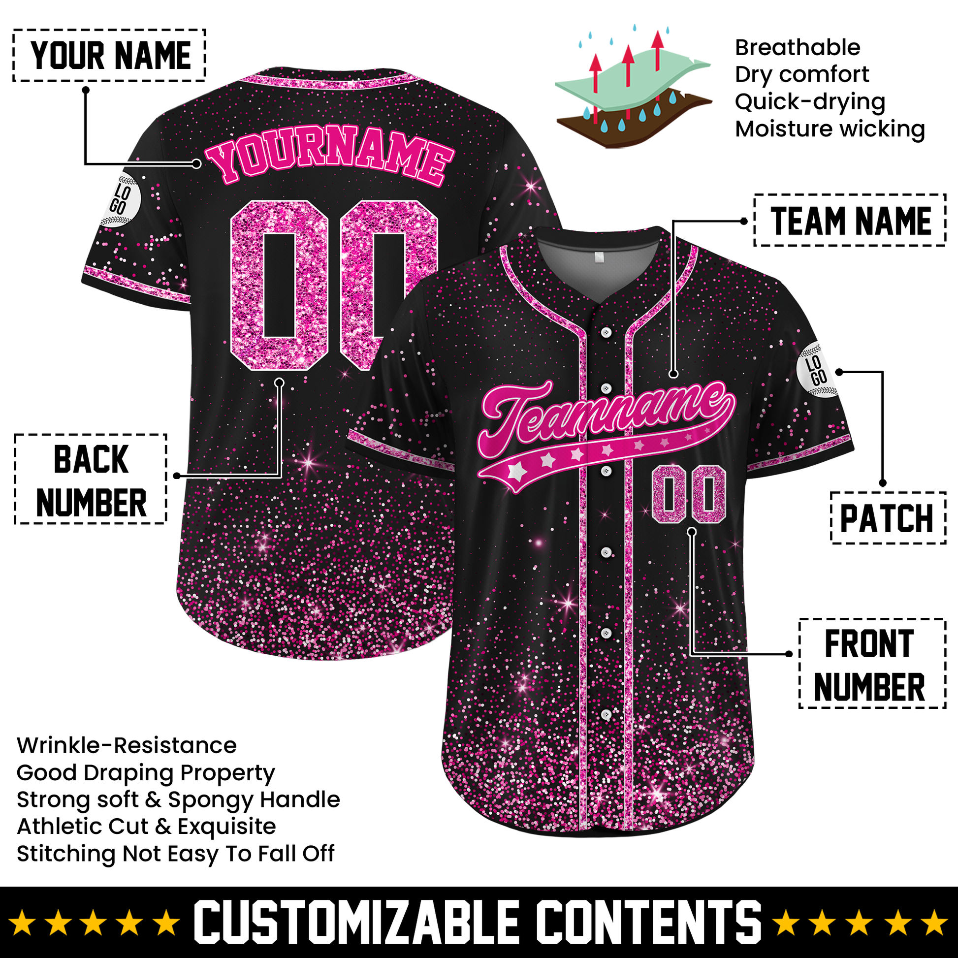 Unleash your team pride in this Custom Black Hot Pink Glitter Cheer Baseball Jersey, personalized with your team name, logo, or number! Crafted for comfort and dynamic movement, this jersey makes you feel powerful, united, and ready to dominate the sidelines or stage.