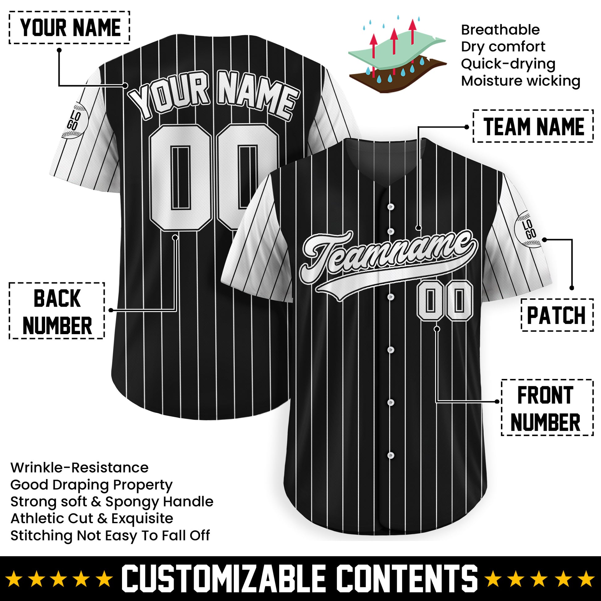 Custom Black White Pinstripe Baseball Shirt