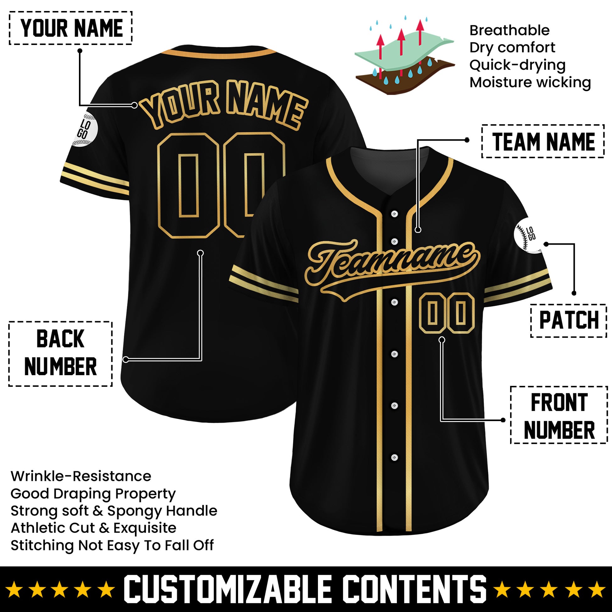 Custom Gold Prestige Black Baseball Jersey – Timeless Style, Personal Touch