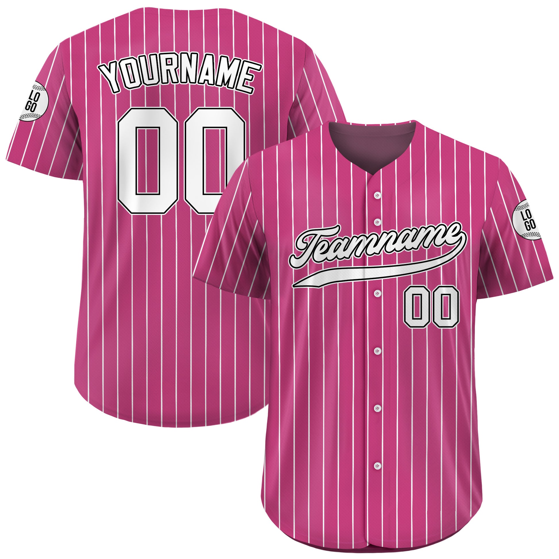 Elevate your team's style with a classic Custom Hot Pink White Pinstripe Baseball Jersey. This jersey is fully customizable, allowing you to add unique team names, logos, and player numbers for a truly professional look. Find the perfect fit for every team member, with a complete range of sizes available for men, women, and youth.