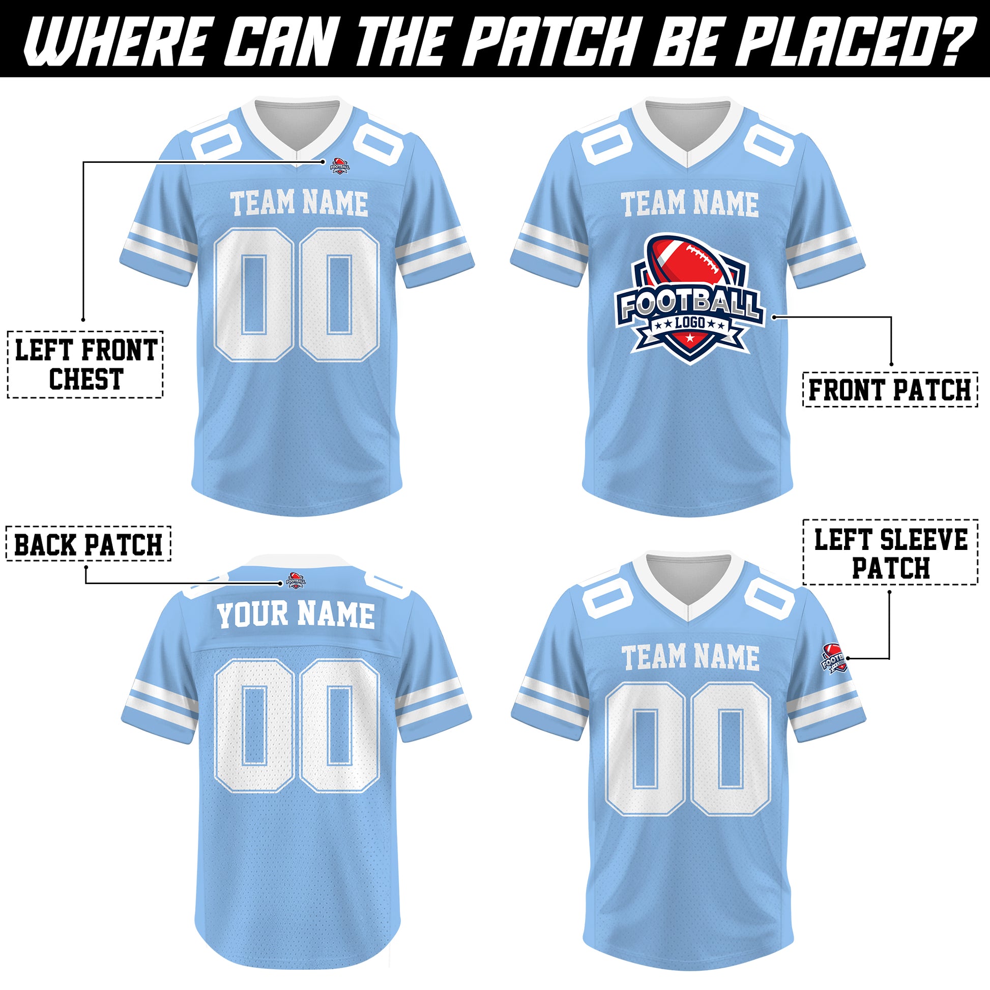 Craft a timeless look with the Custom Light Blue White Football Jersey. Express your individuality by personalizing your own jersey, confidently asserting your unique style. Whether you're proudly supporting your favorite team on game day or simply wearing it as a statement piece in your daily outfit, this jersey is designed for versatility.