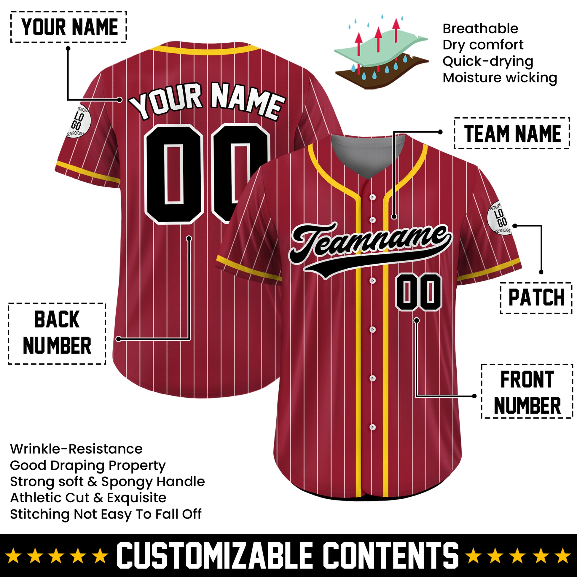 Custom Maroon Pinstripe Baseball Jersey with Gold Trim, Personalized Gift for Men, Women, Dad, Sports Fans