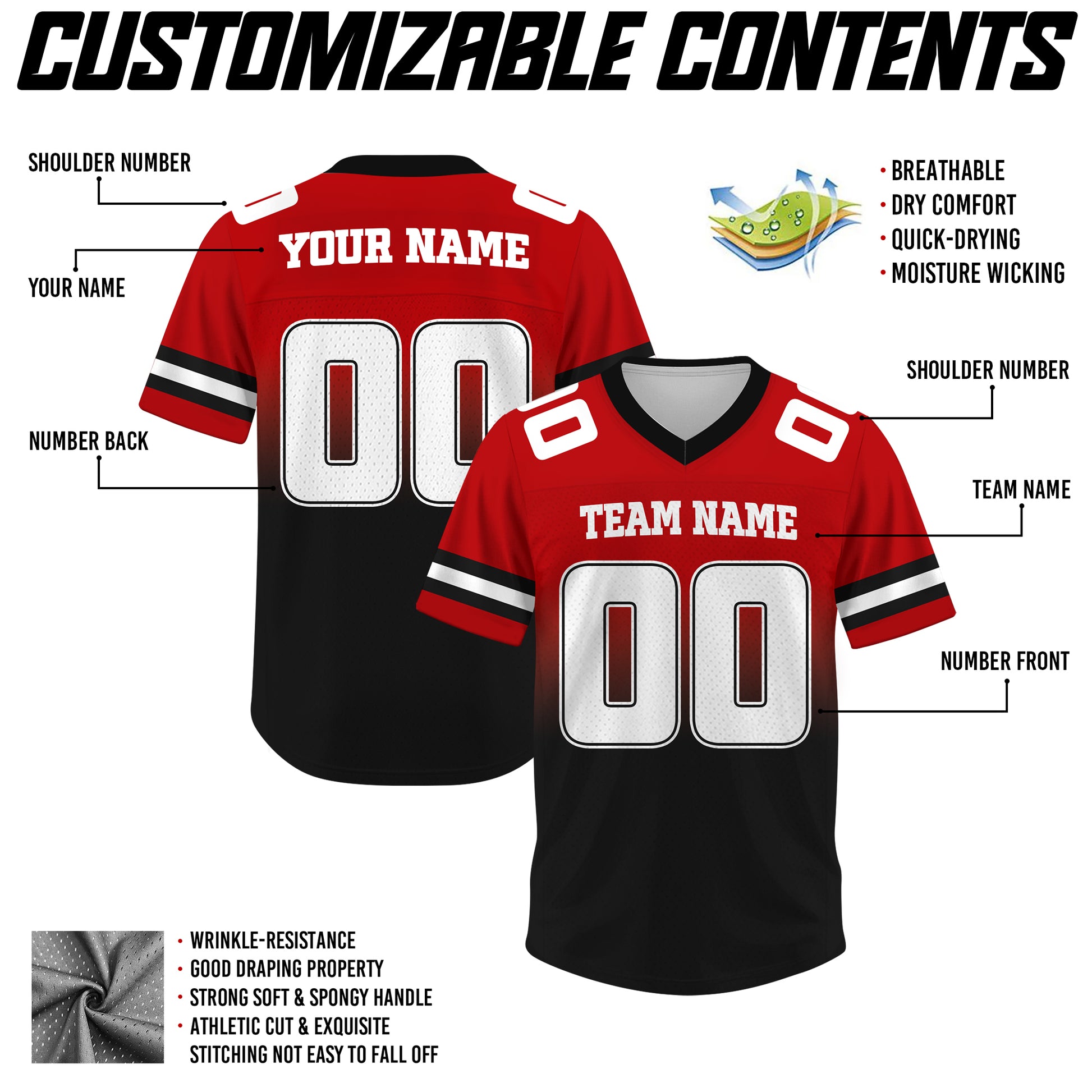 Dive into the game with your own Custom Red Black Gradient Football Jersey!
