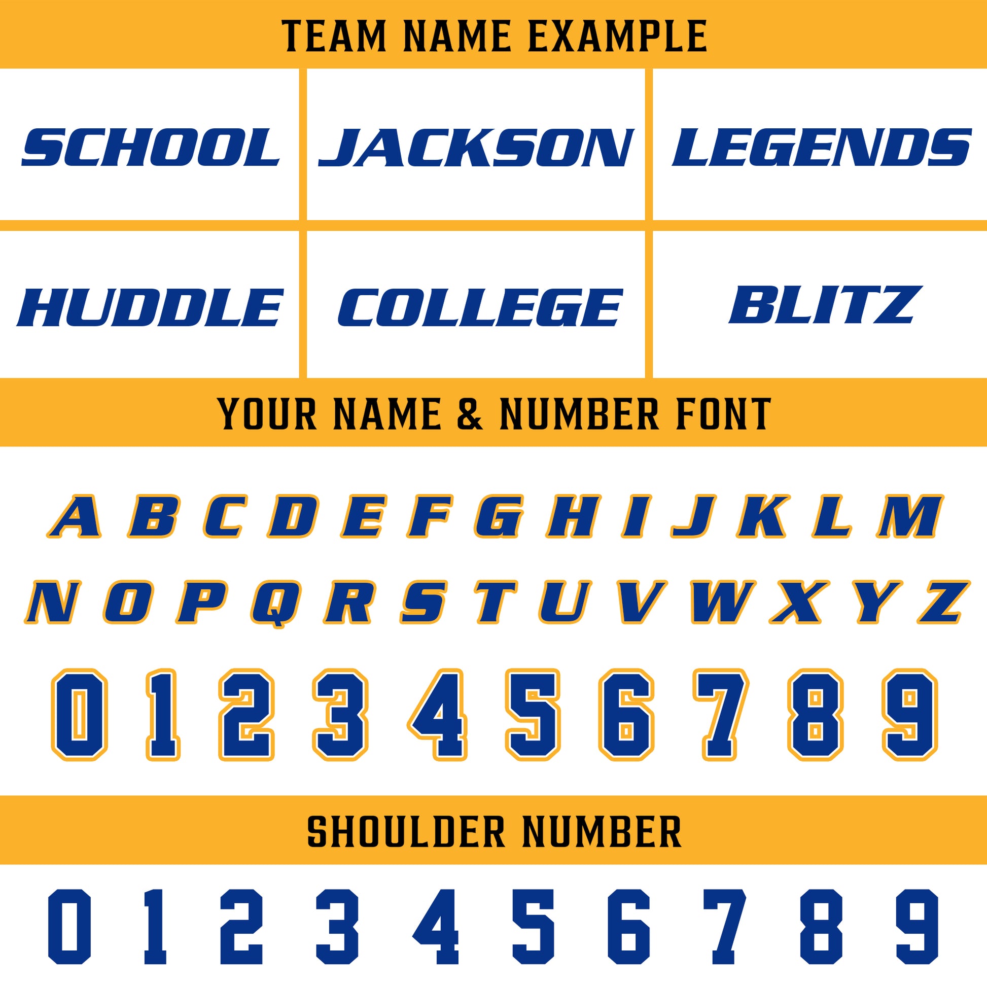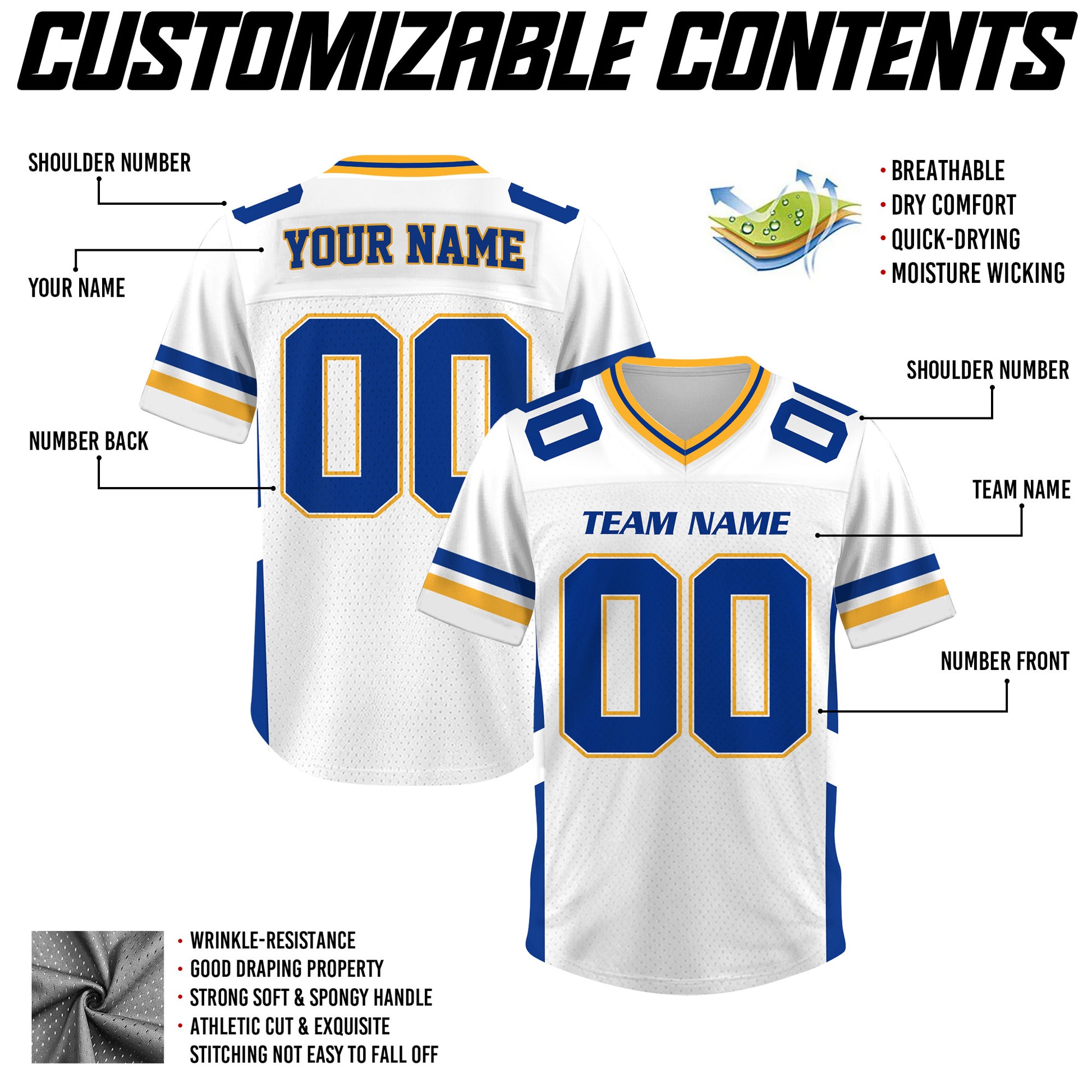 Custom White Blue Gold Football Jersey, Personalized Team Name & Number Football Jersey for Men Women Youth