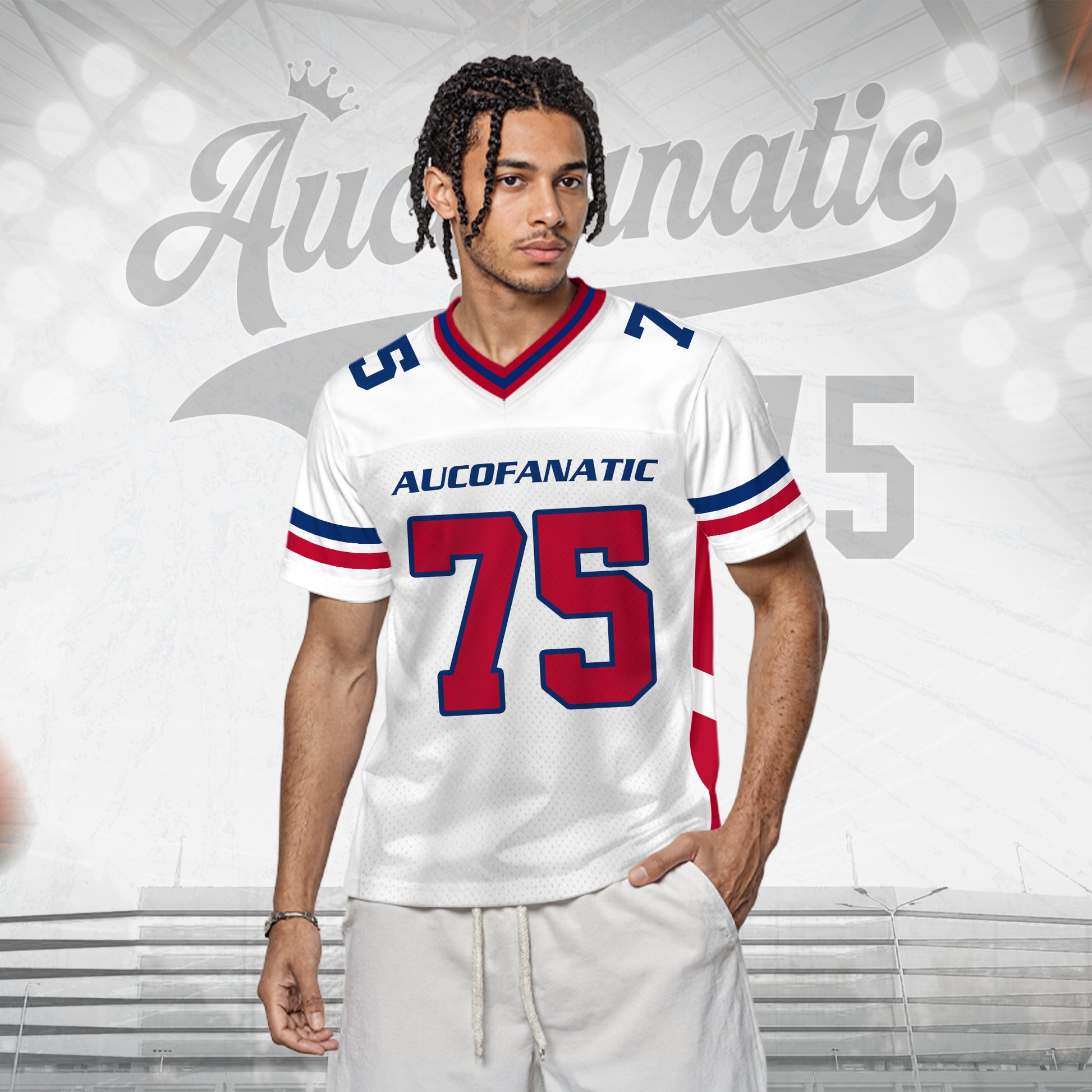Custom White Red Blue Football Jersey, Game Day Outfit For American Football Fan