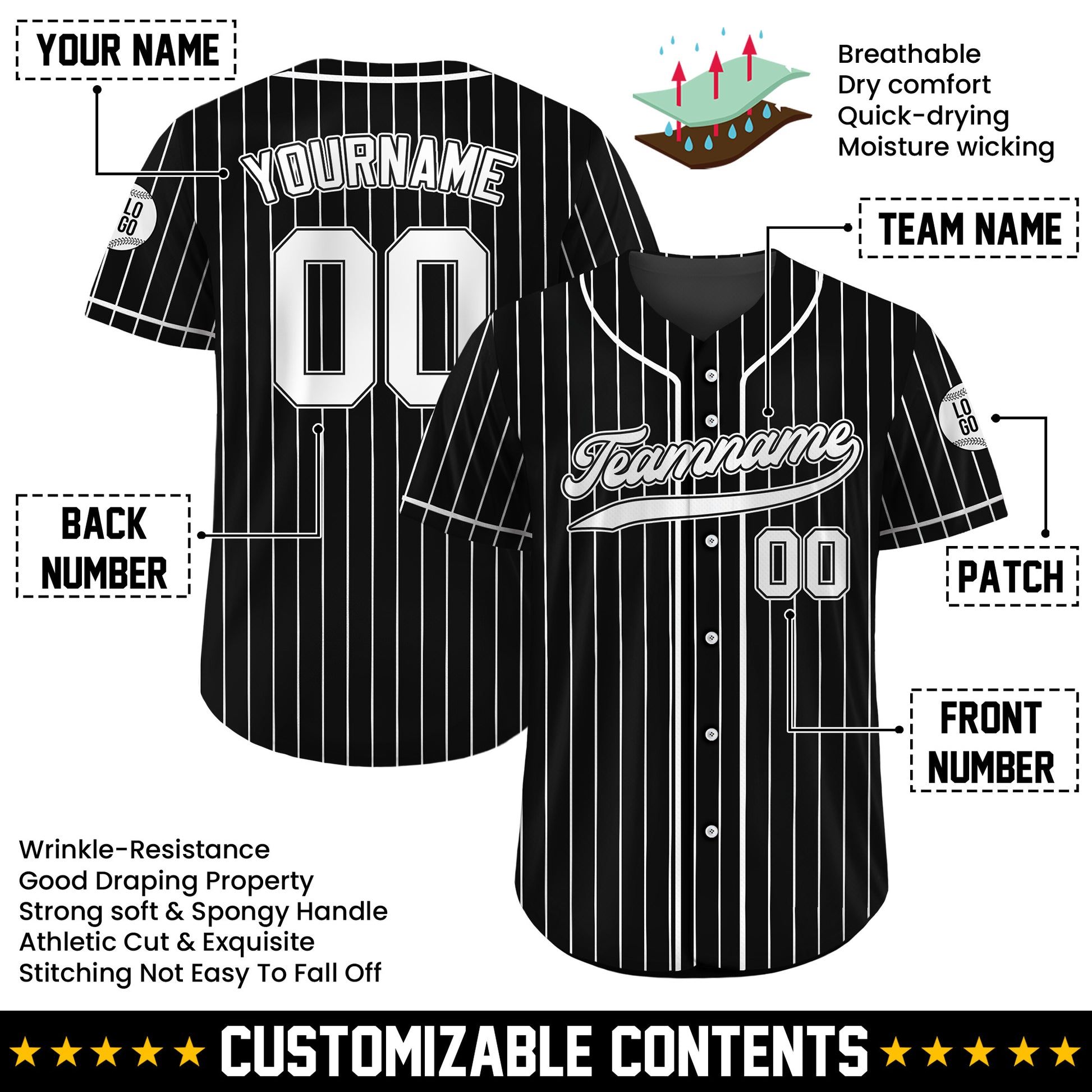 Step onto the field in your own Black White Pinstriped Baseball Jersey, a timeless classic made uniquely for you. This isn't just a shirt—it's your personal statement, blending the authentic feel of game day with a versatile style you can wear anytime.